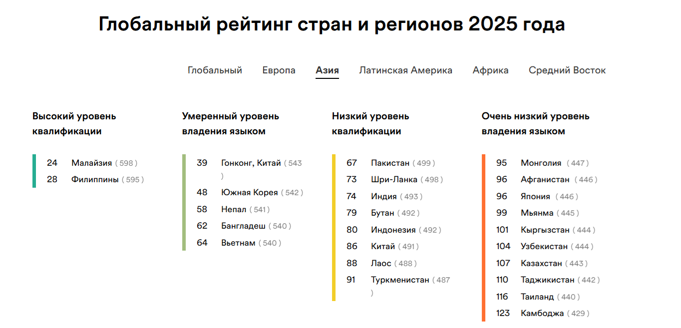 - В регионе Азия в целом наблюдается снижение уровня английского, и Казахстан повторяет эту глобальную тенденцию.