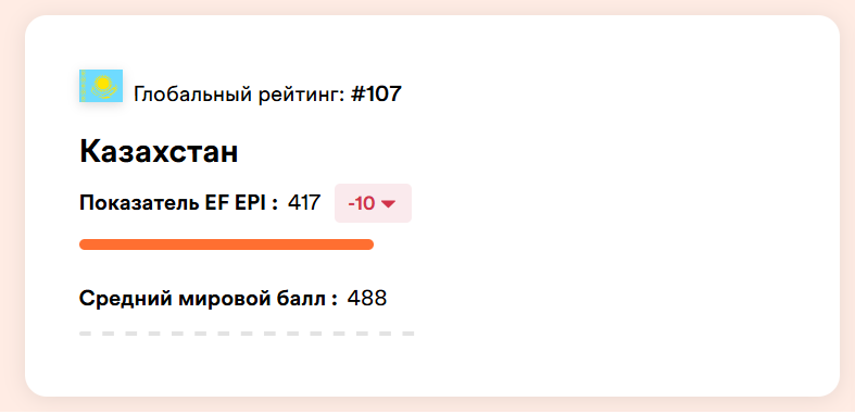 В 2025 году Казахстан занял 107-е место из 123 стран и регионов по уровню владения английским языком. Это означает, что страна по-прежнему находится в категории с «очень низким уровнем» владения английским, с общим баллом 417, что значительно ниже глобального среднего показателя 488.